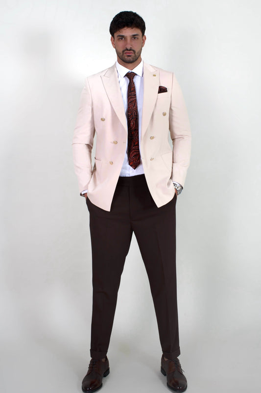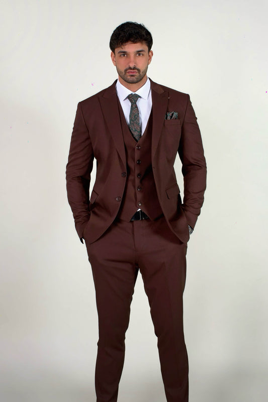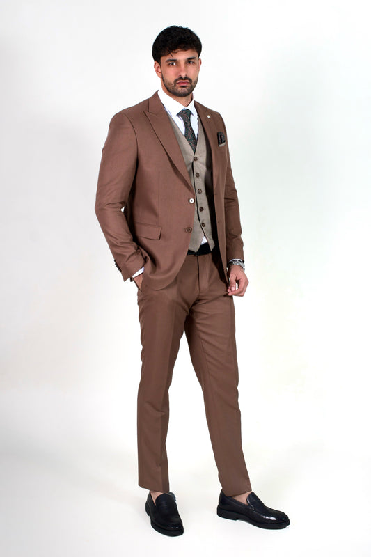 Мъжки костюм Slim Fit от три части в цвят камил с бежов елек
