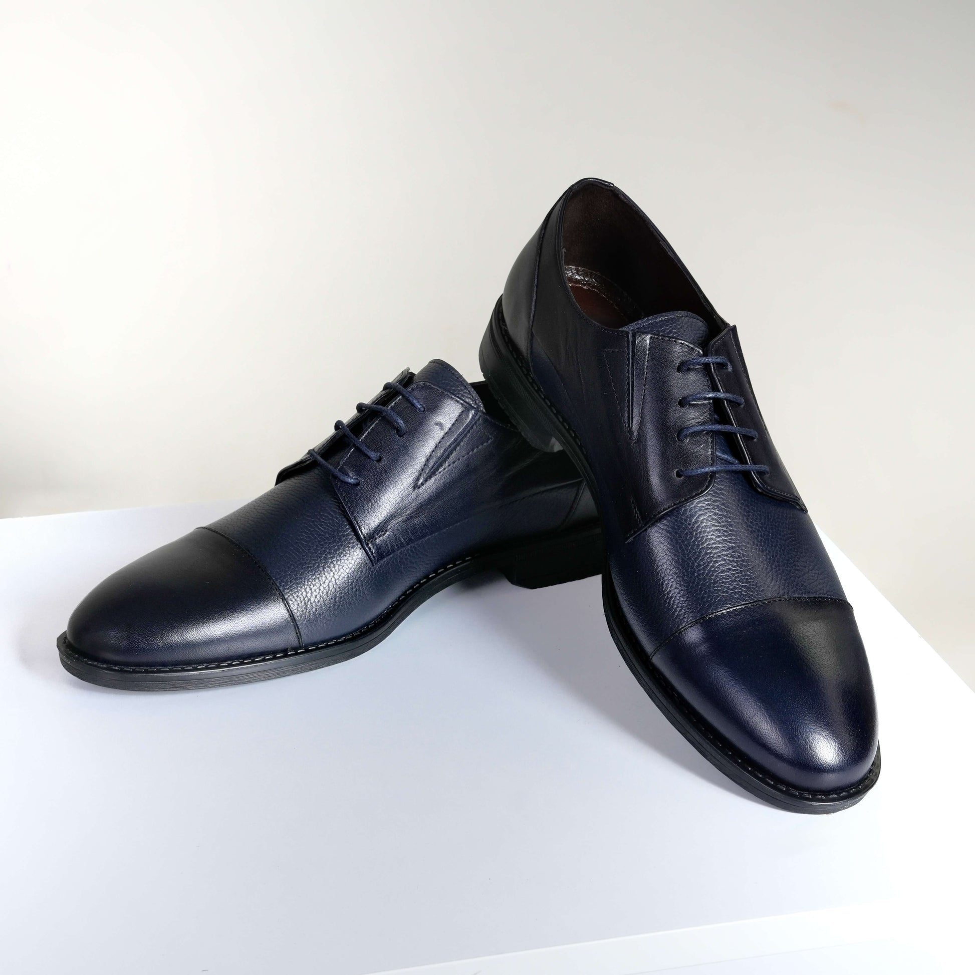 Добавете доза безкомпромисна изтънченост към официалната си визия с тези луксозни мъжки обувки в наситен тъмносин цвят. Моделът майсторски съчетава наситения блясък на гладката кожа с модерна фина перфорация в средната част, създавайки динамичен и запомнящ се силует. Елегантният изчистен връх и прецизните тънки връзки завършват този класически дизайн, осигурявайки стабилност и висок стил при всяка стъпка.
