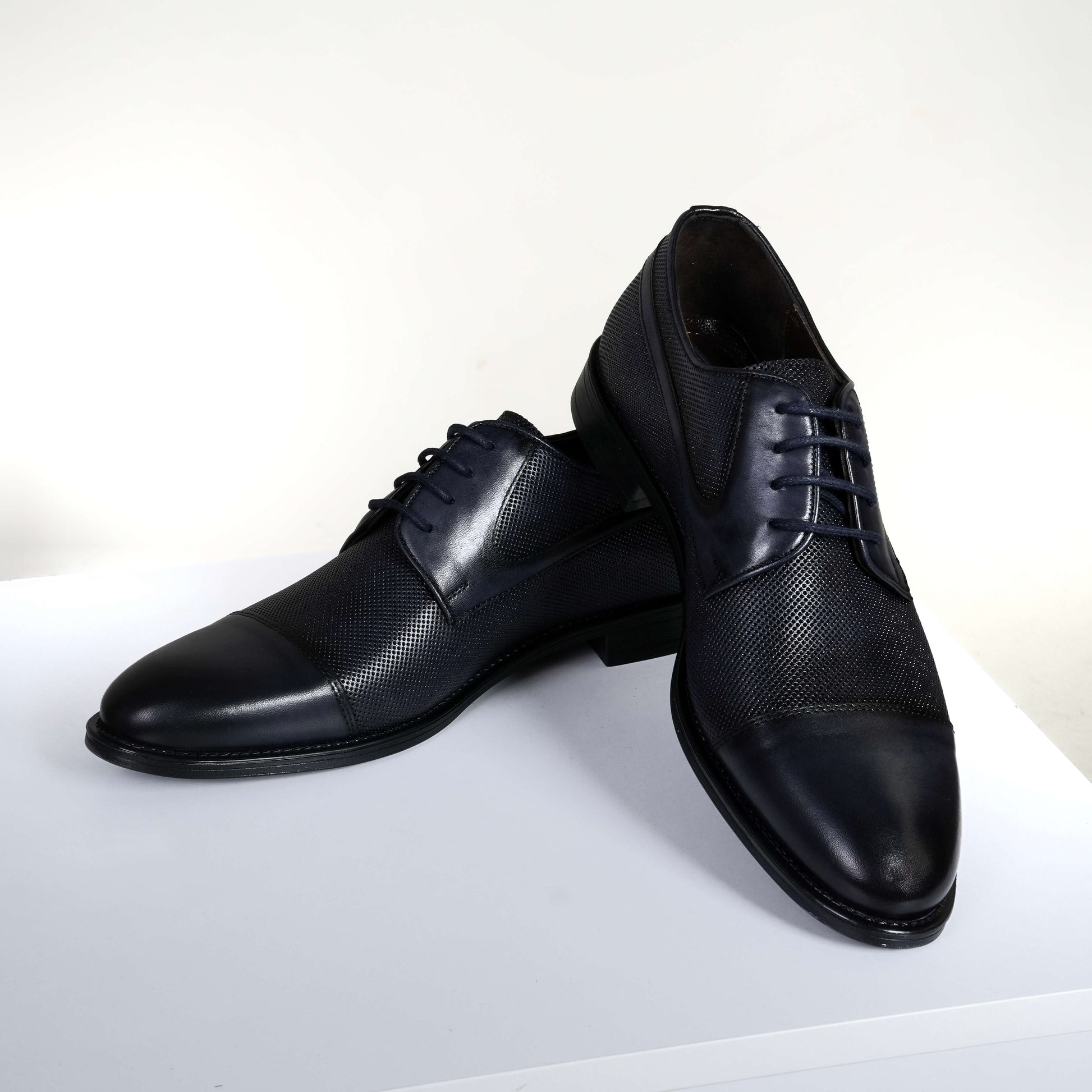 Добавете доза безкомпромисна изтънченост към официалната си визия с тези луксозни мъжки обувки в наситено син цвят. Моделът майсторски съчетава гладката повърхност на премиум кожата с модерна перфорирана текстура, създавайки динамичен и запомнящ се силует. Елегантната черна подметка и прецизните връзки завършват този класически дизайн тип „Дерби“, осигурявайки стабилност и стил при всяка стъпка.