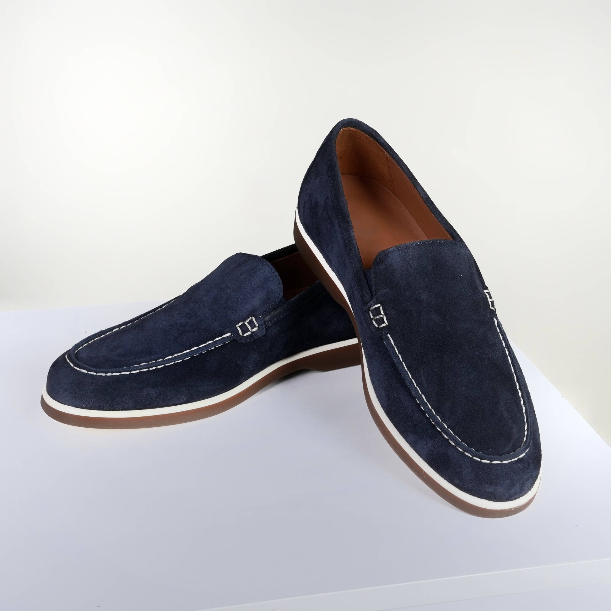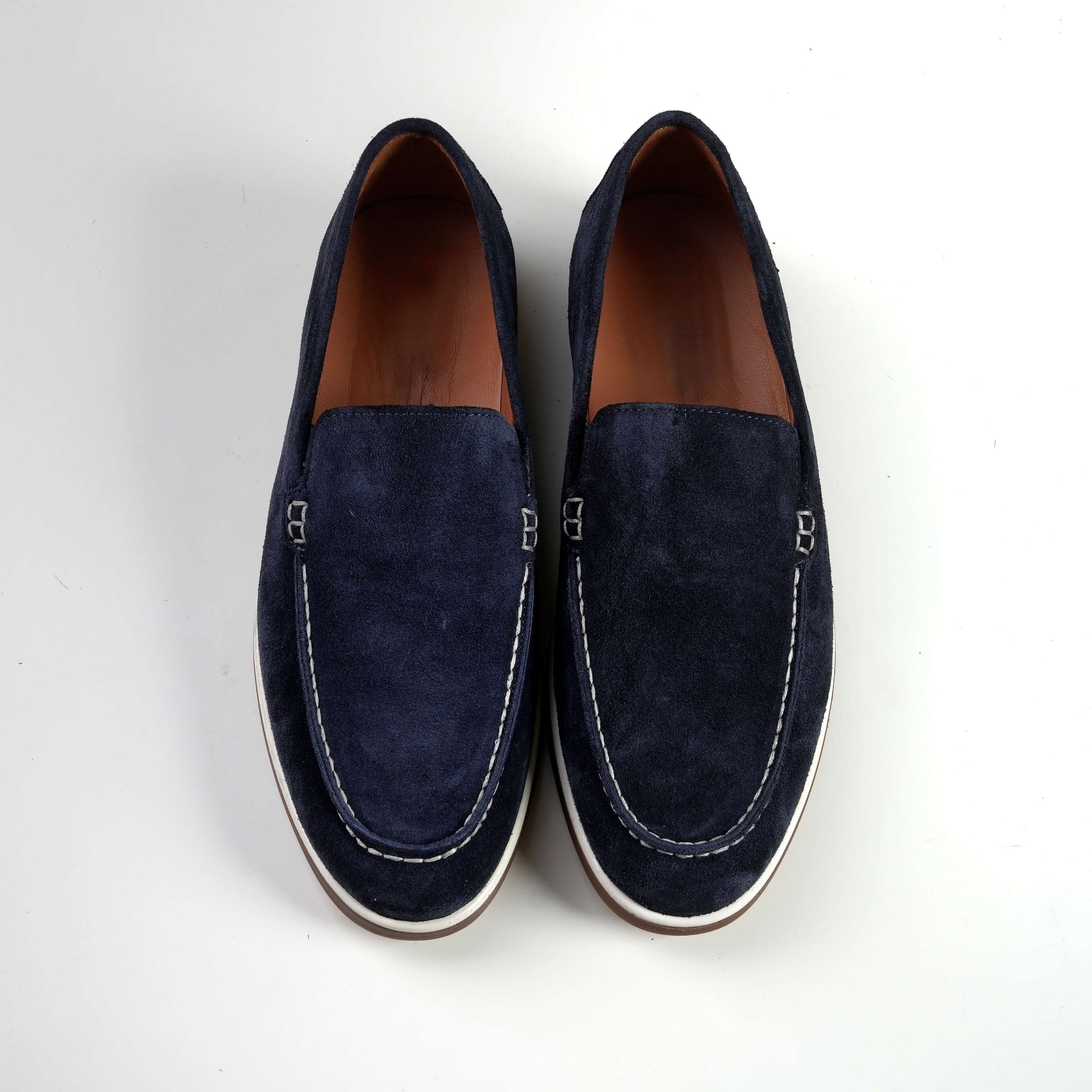 Добавете доза безкомпромисна изтънченост към ежедневната си визия с тези луксозни мъжки мокасини в дълбоко тъмносин нюанс. Моделът майсторски съчетава кадифената мекота на първокласния естествен велур с контрастни бели шевове, създавайки динамичен и запомнящ се силует. Елегантната двуцветна подметка и прецизната ръчна изработка завършват този класически дизайн, осигурявайки стабилност и лекота при всяка стъпка.